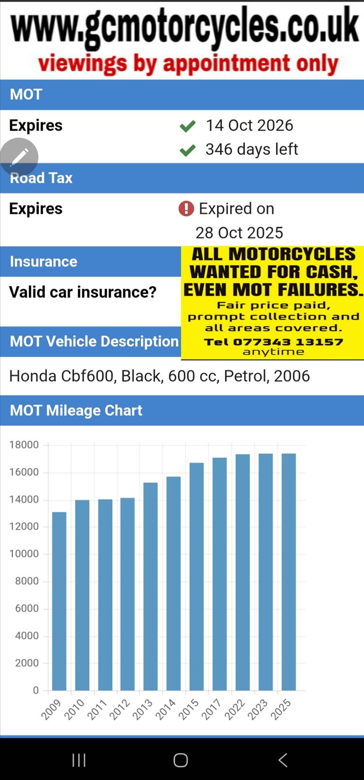 GENUINE UK HPI CLEAR HONDA CBF600 SA-5 ABS, REGISTERED 27/04/2006, 2 PREVIOUS OWNERS, ONLY 17,385 GENUINE MILES SUPPORTED BY GOV.UK CHECK SITE, COMES WITH SERVICE BOOK, OLD MOTS AND SERVICE RECIEPTS etc, ORIGINAL TOOLKIT UNDER THE SEAT, ATTRACTIVE LOOKING BIKE FINISHED IN FACTORY GLOSS BLACK HONDA PAINTWORK, ABS BRAKES, FITTED WITH PYRAMID HUGGER OTHERWISE COMPLETELY ORIGINAL THROUGHOUT. STARTS, RUNS AND RIDES SUPERB WITH NO FAULTS. NEW FRONT TYRE AND 12 MONTHS MOT, GOOD RELIABLE HONDA CBF600 WITH COMFORTABLE RIDING POSITION AND GOOD MPG. NICE BIKE FOR SOMEBODY, PRICED TO SELL , NO OFFERS, BARGAIN