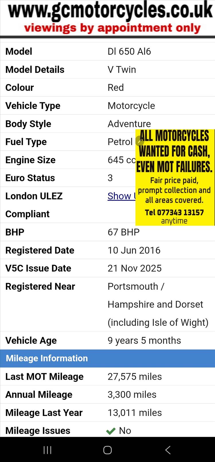 GENUINE UK HPI CLEAR 2016 SUZUKI DL650 AL6 VSTROM ABS WITH DATATAG. LOVELY EXAMPLE, 2 PREVIOUS OWNERS, 37,834 MILES SUPPORTED BY GOV.UK CHECK SITE, SPARE KEY, ORIGINAL TOOLKIT UNDER THE SEAT, A VERY ATTRACTIVE LOOKING BIKE FITTED WITH SEVERAL EXTRAS incl .. DETACHABLE LUGGAGE BOX BY KAPPA WITH SPARE KEY, COMFORT SEAT WITH VSTROM LOGO, CRASH BARS, HAND GUARDS, GIVI SCREEN, OPTIMATE BATTERY CHARGER LEAD, OXFORD HEATED GRIPS, SATNAV MOUNT. FITTED WITH NEW BRIDGESTONE BATTLAX TYRES AND 12 MONTHS MOT. AN EXCELLENT ADVENTURE BIKE FOR SOMEBODY. PRICED VERY COMPETITIVELY SO STRICTLY NO OFFERS, FIRST TO SEE WILL BUY . BARGAIN