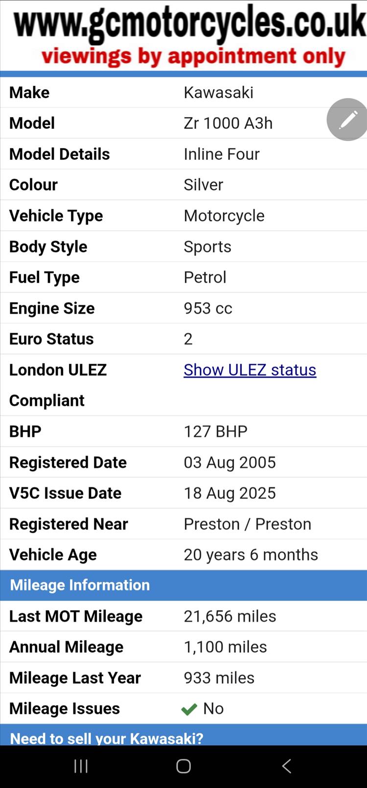 GENUINE UK HPI CLEAR 2005 KAWASAKI Z1000 ZR1000A3H FINISHED IN COOL SATIN SILVER WITH ONLY 3 PREVIOUS OWNERS AND 22,995 MILES SUPPORTED BY GOV.MOT WEBSITE, COMES WITH SPARE UNUSED KEY , OWNERS MANUAL, SERVICE BOOK, DATATAG, SERVICE HISTORY INCLUDING VALVE CLEARANCES etc . THIS IS A BEAUTIFUL LOOKING BIKE IN FACTORY PAINTWORK WITH ORIGINAL KAWASAKI EXHAUST SYSTEM, EXTRAS INCLUDING REAR SEAT COWL, PAZZO STYLE MULTI ADJUSTABLE LEVERS, IRIDIUM SCREEN, RENTHALL STYLE SLIGHTLY TALLER BARS, TAIL TIDY, CRASH BUNGS, RECENT OIL / FILTER AND COOLANT CHANGE. A LOVELY LOOKING BIKE, RIDES AND PERFORMS REALLY WELL , 12 MONTHS MOT , PRICED SENSIBLY FOR A QUICK SALE , NO OFFERS OR MESSERS , FIRST TO SEE WILL BUY , BARGAIN