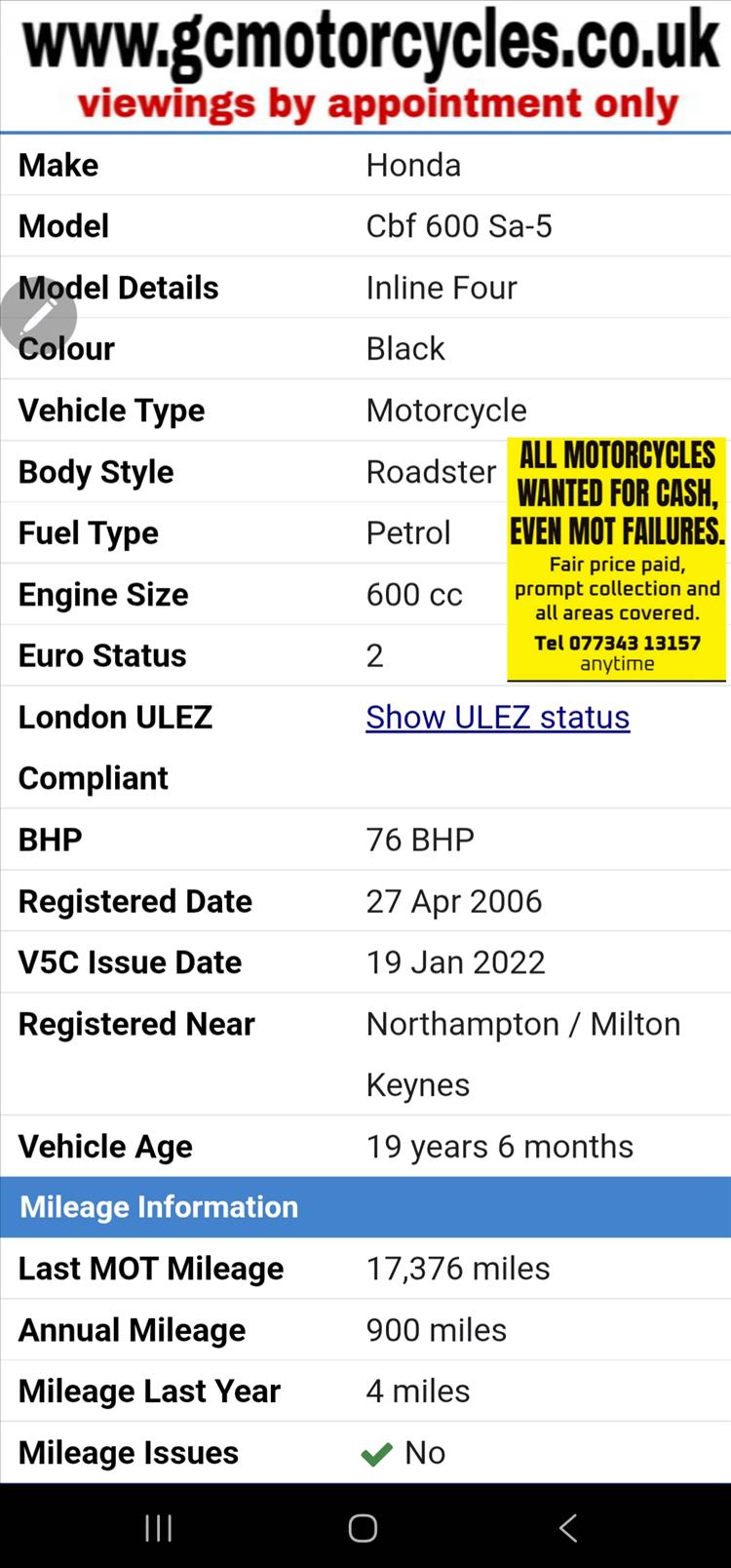 GENUINE UK HPI CLEAR HONDA CBF600 SA-5 ABS, REGISTERED 27/04/2006, 2 PREVIOUS OWNERS, ONLY 17,385 GENUINE MILES SUPPORTED BY GOV.UK CHECK SITE, COMES WITH SERVICE BOOK, OLD MOTS AND SERVICE RECIEPTS etc, ORIGINAL TOOLKIT UNDER THE SEAT, ATTRACTIVE LOOKING BIKE FINISHED IN FACTORY GLOSS BLACK HONDA PAINTWORK, ABS BRAKES, FITTED WITH PYRAMID HUGGER OTHERWISE COMPLETELY ORIGINAL THROUGHOUT. STARTS, RUNS AND RIDES SUPERB WITH NO FAULTS. NEW FRONT TYRE AND 12 MONTHS MOT, GOOD RELIABLE HONDA CBF600 WITH COMFORTABLE RIDING POSITION AND GOOD MPG. NICE BIKE FOR SOMEBODY, PRICED TO SELL , NO OFFERS, BARGAIN