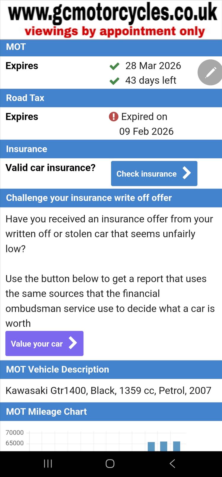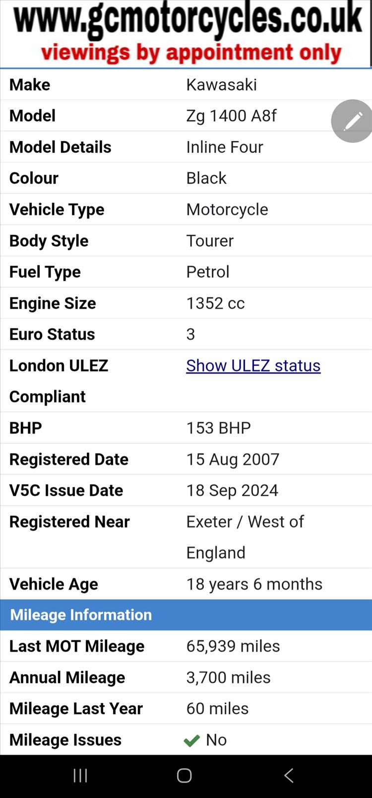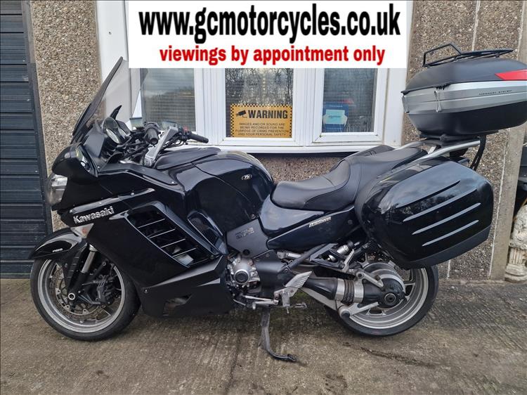 GENUINE UK HPI CLEAR KAWASAKI GTR1400 ZG1400A8F REGISTERED 15/08/07 , COMES WITH SPARE TRANSPONDER, OWNERS MANUAL, SERVICE BOOK AND HISTORY etc . 66,047 MILES SUPPORTED BY GOV.UK CHECKSITE, 6 PREVIOUS OWNERS , FINISHED IN FACTORY BLACK METALIC PAINTWORK WITH TRIPLE LUGGAGE SYSTEM , REMUS CARBON FIBRE PERFORMANCE EXHAUST- MAKES A LOVELY TONE , RECENT SERVICE AND NEW SET OF TYRES . STARTS , RUNS AND RUDES SUPERB - A LOVELY ATTRACTIVE TOURING BIKE WITH NO ACCIDENT DAMAGE OF ANY SIGNIFICANCE, PRICED SENSIBLY FOR A QUICK EASY SALE , STRICTLY NO OFFERS OR MESSERS , FIRST TO SEE WILL DEFINITELY BUY , BARGAIN